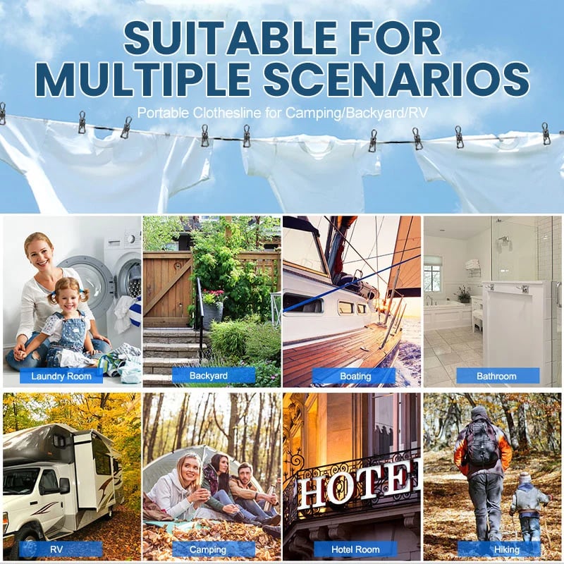Attaches Everywhere: Easy to fasten with two strong metal hooks. Portable travel clothesline can be fixed anywhere: hotel, bathroom, backyard, laundry room, RV, boat, balcony, or even fixed on trees.