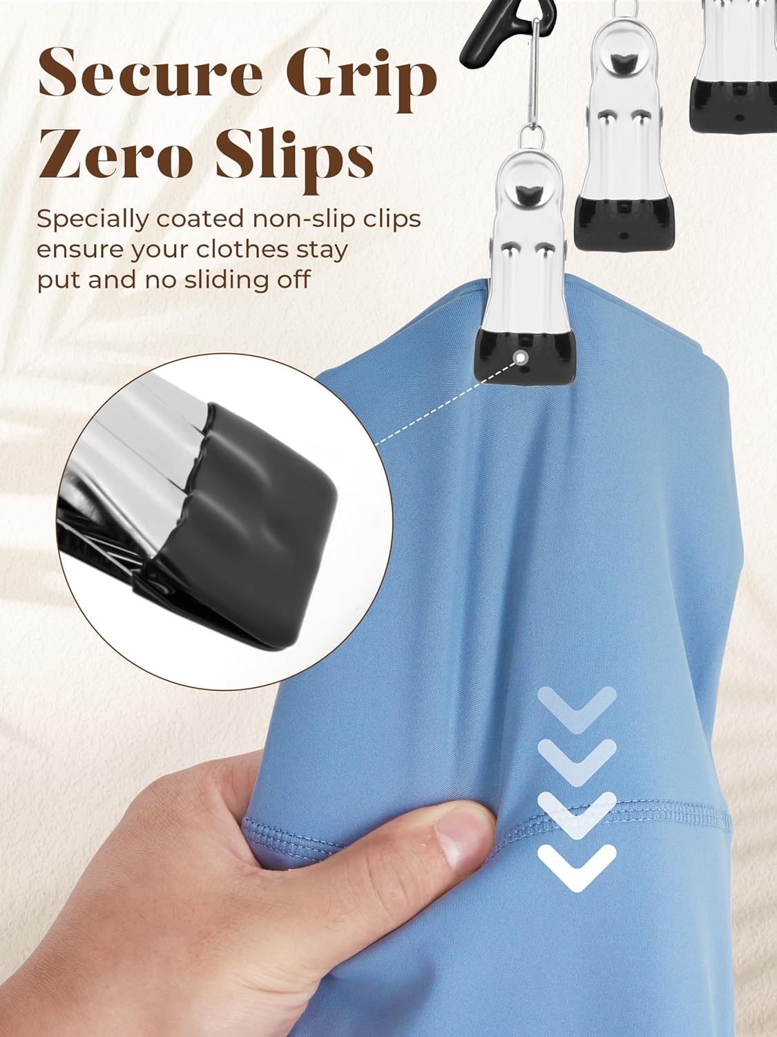 - Made of high-quality stainless steel, these hangers are strong and durable, ensuring your clothes stay securely in place. The plastic-coated clips prevent damage, leaving no marks or imprints on your clothes—perfect for keeping your favorite items in perfect condition!