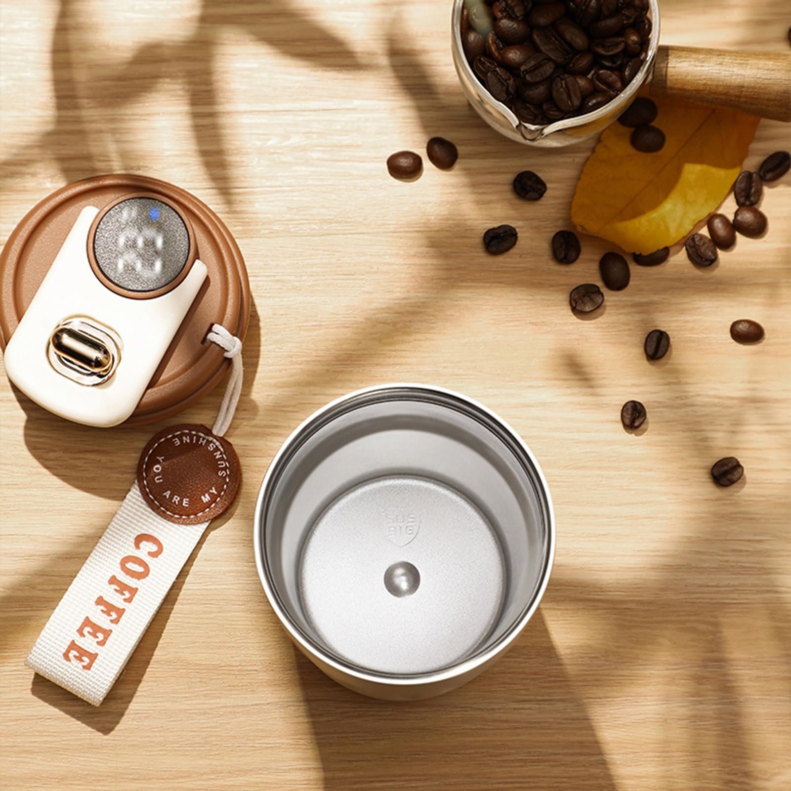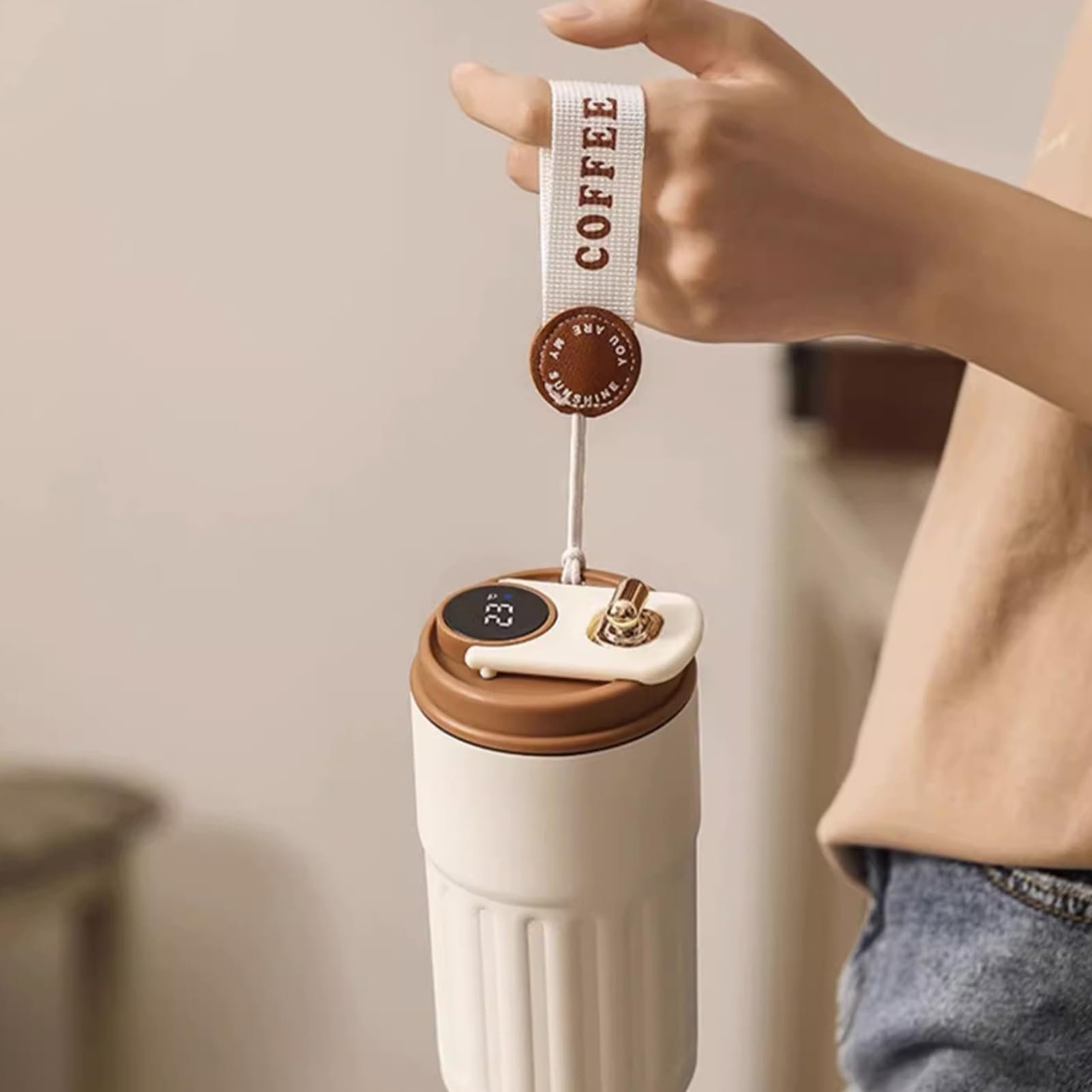 The coffee mug has a clear Celsius display and the double-wall vacuum insulation keeps drinks warm for up to 4 hours and cold drinks cold for up to 6 hours.
