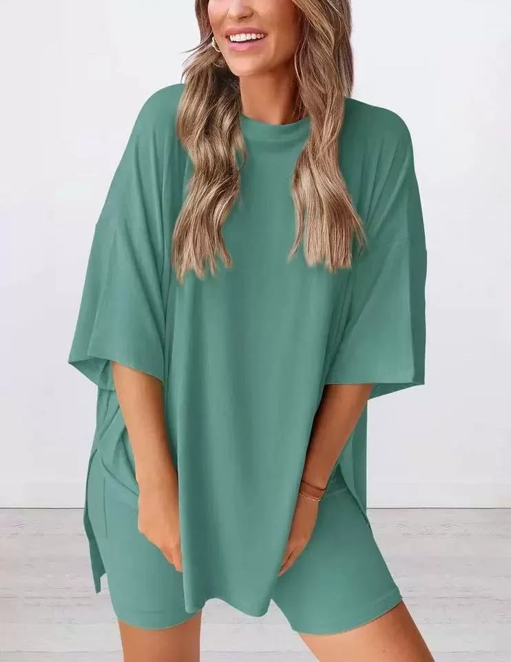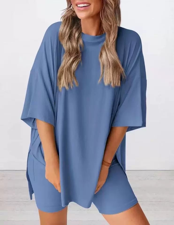 Oversized Tee & High-Waisted Biker Shorts : The oversized tee offers a relaxed fit that's perfect for hiding those unwanted bumps, while the high-waisted shorts provide the right amount of support and style. Together, they create the perfect loungewear combo!
